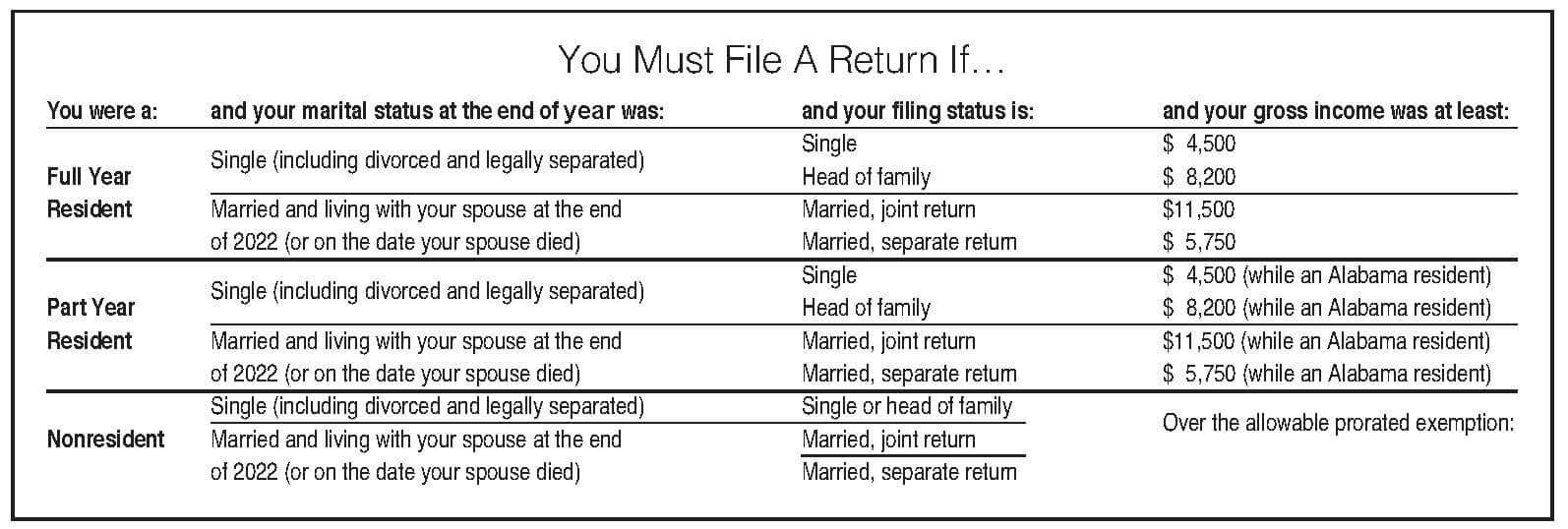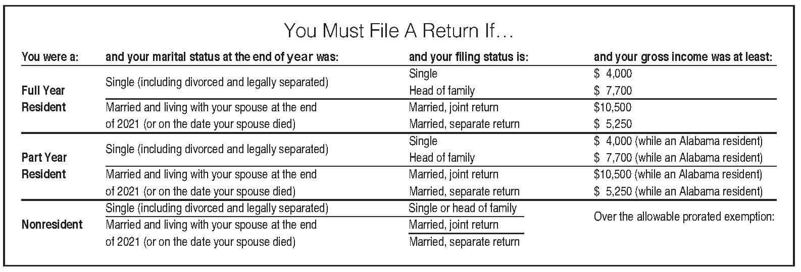 Individuals who meet certain taxable income thresholds and are domiciled in Alabama are required to file an Alabama Individual income tax return.